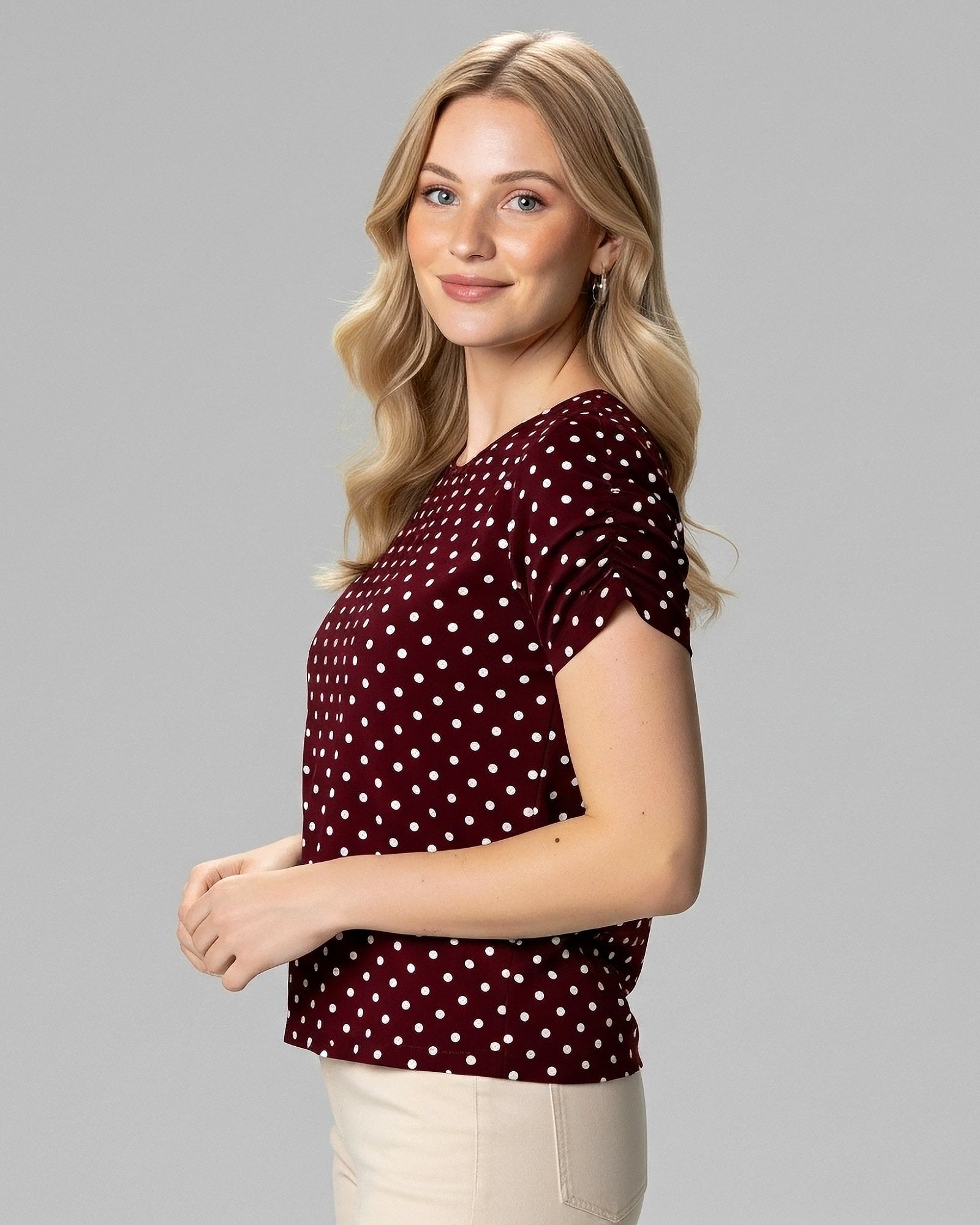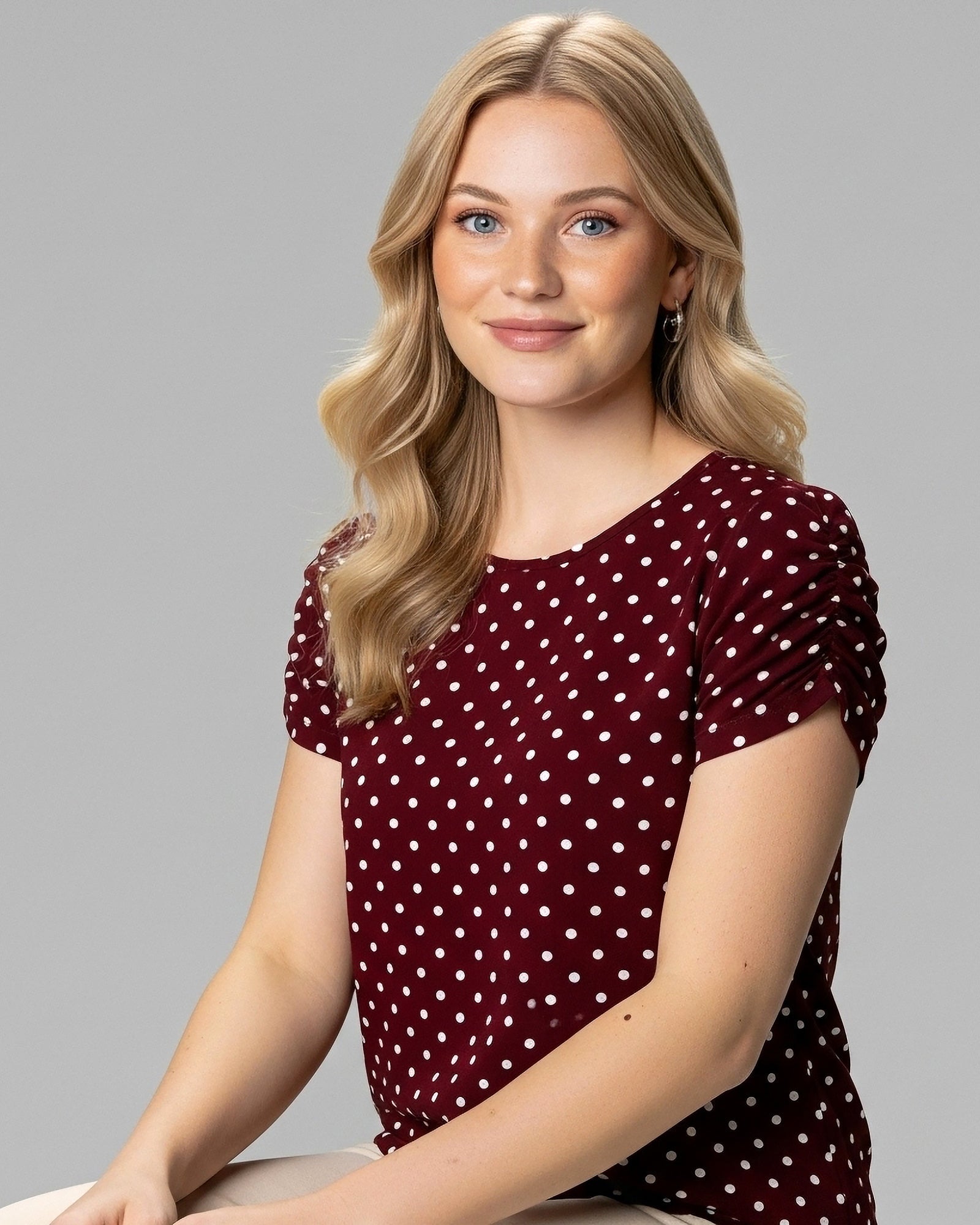 Blusa Bufante Poá Bordô em malha premium de alta qualidade, traz mangas bufantes elegantes e estampa poá versátil, perfeita para composições modernas.